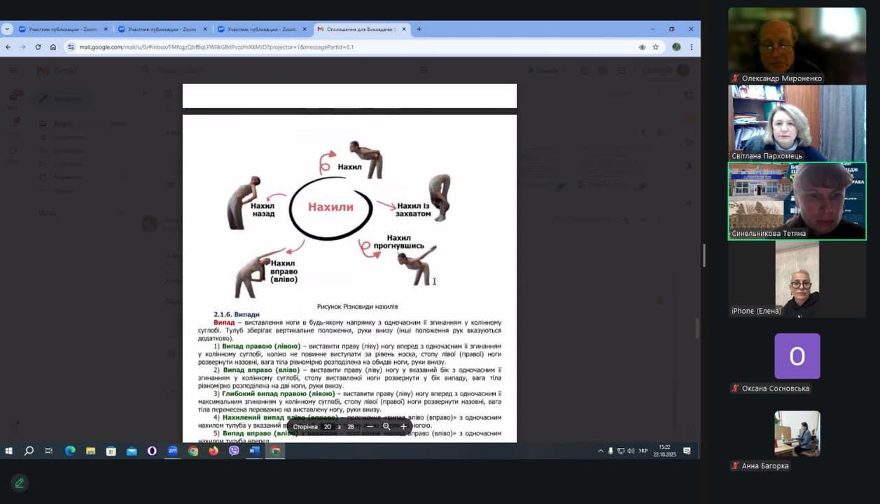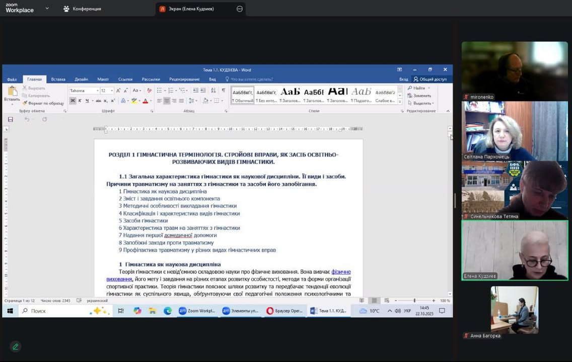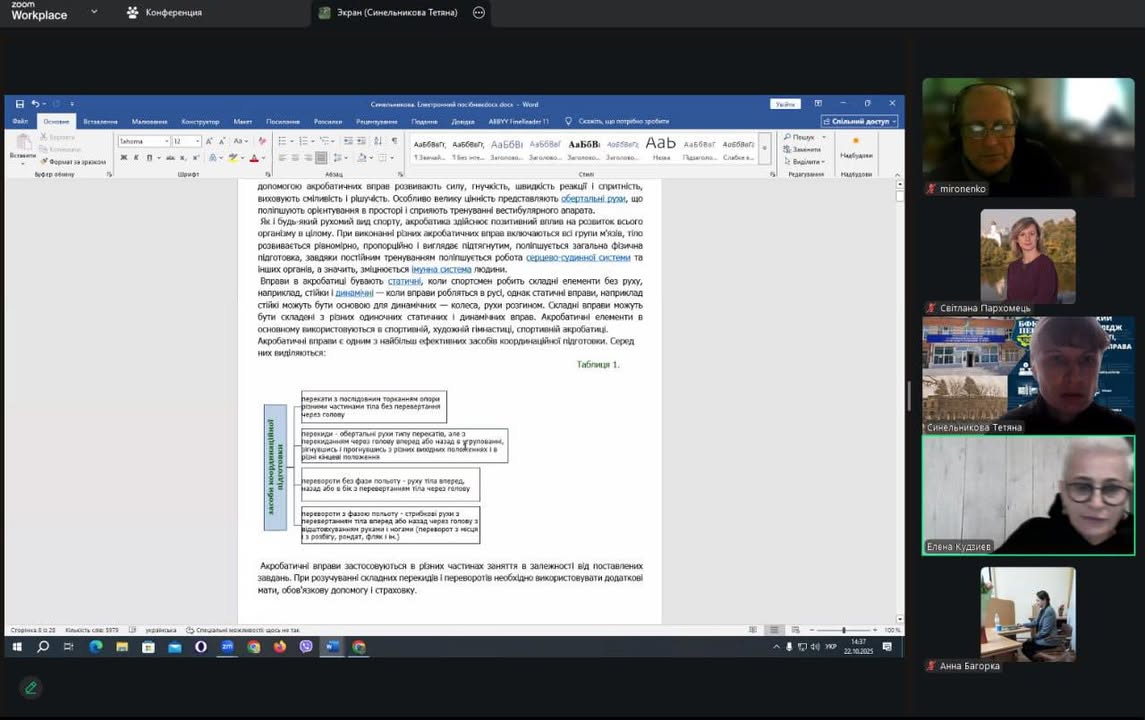 22 жовтня 2025 року під головуванням заступника директора з навчальної роботи коледжу Світлани ПАРХОМЕЦЬ, за участі Олександра МИРОНЕНКА, методиста ДУ «Науково-методичний центр вищої та фахової передвищої освіти», відбулося засідання робочої групи зі створення навчально-методичного забезпечення ОК «Теорія і методика гімнастики, ритміки та хореографії» для спеціальності А7 «Фізична культура і спорт». В засіданні взяли участь члени робочої групи: Олена КУДЗІЄВА, викладач Дніпропетровського фахового коледжу спорту, Тетяна СИНЕЛЬНИКОВА, викладач Бердичівського фахового коледжу промисловості, економіки і права, Оксана СОСНОВСЬКА , викладач Львівського фахового коледжу спорту, Анна БАГОРКА, викладач економіко-правничого фахового коледжу Запорізького національного університету. Під час засідання активно обговорили частини інтерактивного посібника, які створені членами робочої групи відповідно до затвердженої орієнтовної навчальної програми освітнього компонента, склали план роботи на 2025/2026 н.р. Працюємо далі…